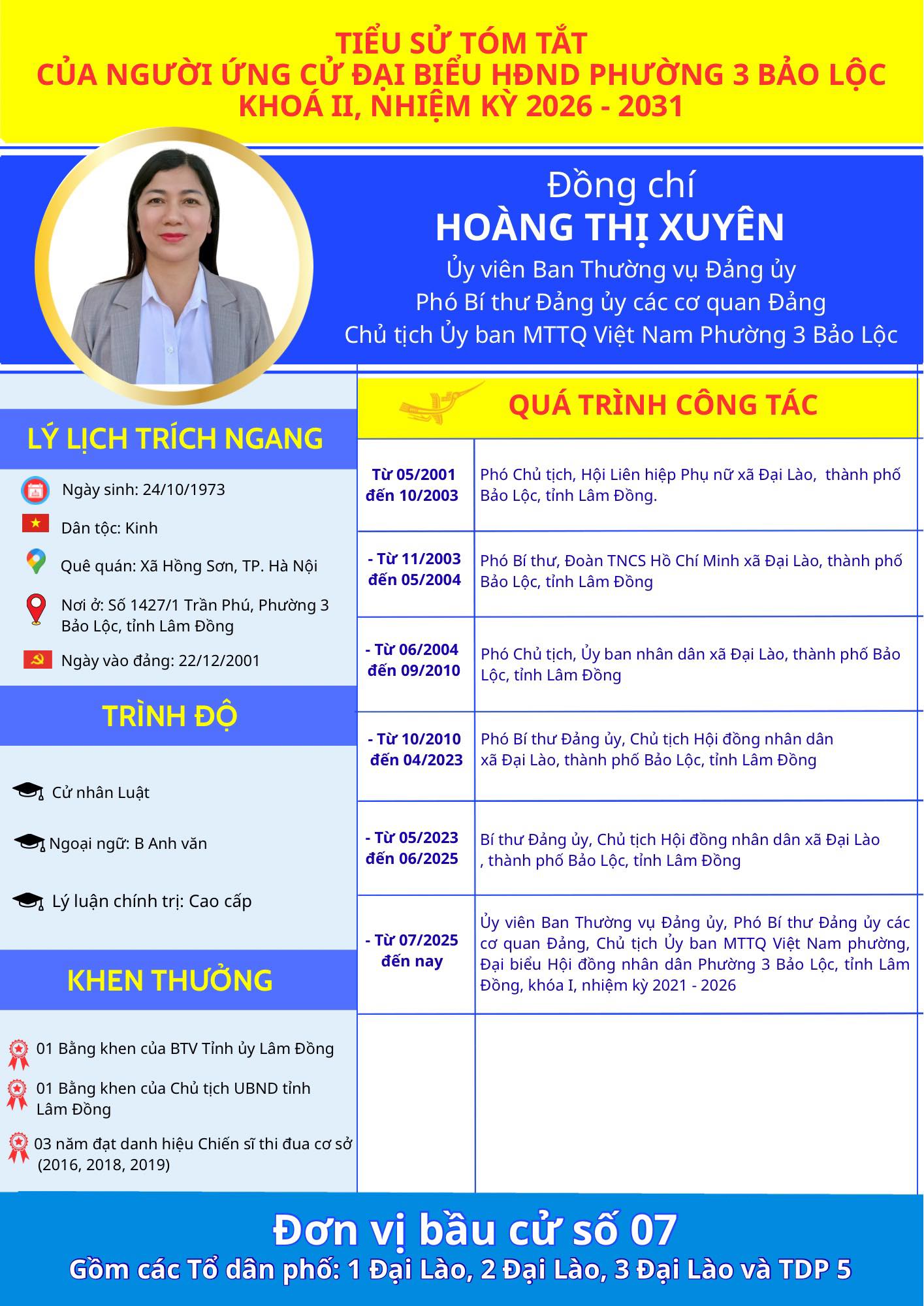 Đồng chí HOÀNG THỊ XUYÊN - UV.BTV, Phó Bí thư Đảng ủy các cơ quan Đảng, Chủ tịch MTTQ VIỆT NAM Phường 3 Bảo Lộc. Ứng cử Đại biểu Hội đồng nhân dân phường 3 Bảo Lộc, Khoá II, nhiệm kỳ 2026 - 2031.