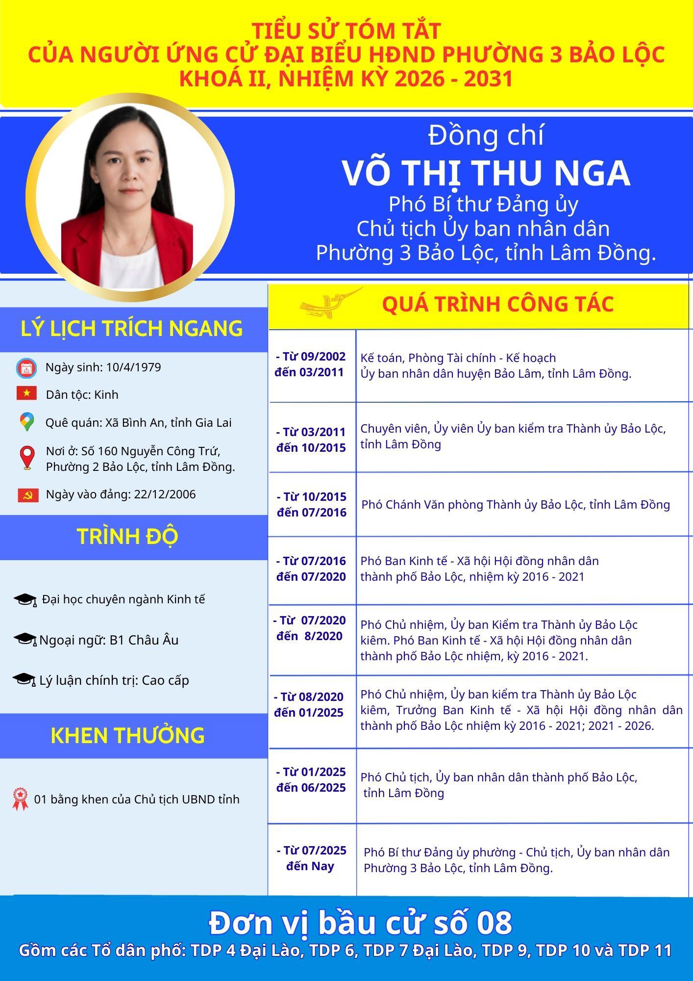 Đồng chí VÕ THỊ THU NGA, Phó Bí thư Đảng ủy - Chủ tịch UBND Phường 3 Bảo Lộc, Ứng cử Đại biểu Hội đồng nhân dân phường 3 Bảo Lộc, Khoá II, nhiệm kỳ 2026 - 2031.