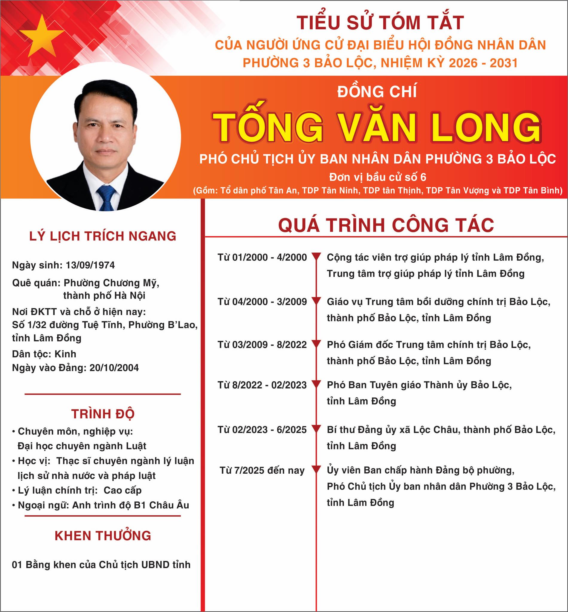 Đồng chí TỐNG VĂN LONG - UVBCH - Phó Chủ tịch Ủy ban nhân dân Phường 3 Bảo Lộc. Ứng cử đại biểu HĐND Phường 3 Bảo Lộc, khoá II, nhiệm kỳ 2026 - 2031
