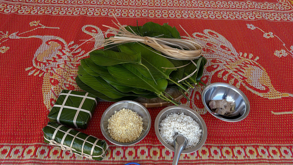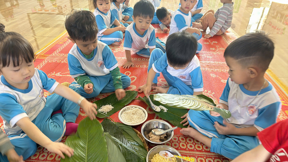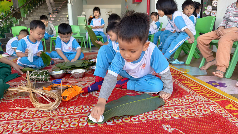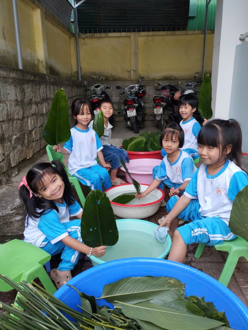Dưới sự hướng dẫn tận tình của giáo viên, trẻ được làm quen với các nguyên liệu quen thuộc như lá dong, gạo nếp, đậu xanh, thịt lợn và từng bước thực hành gói bánh theo khả năng của mình.