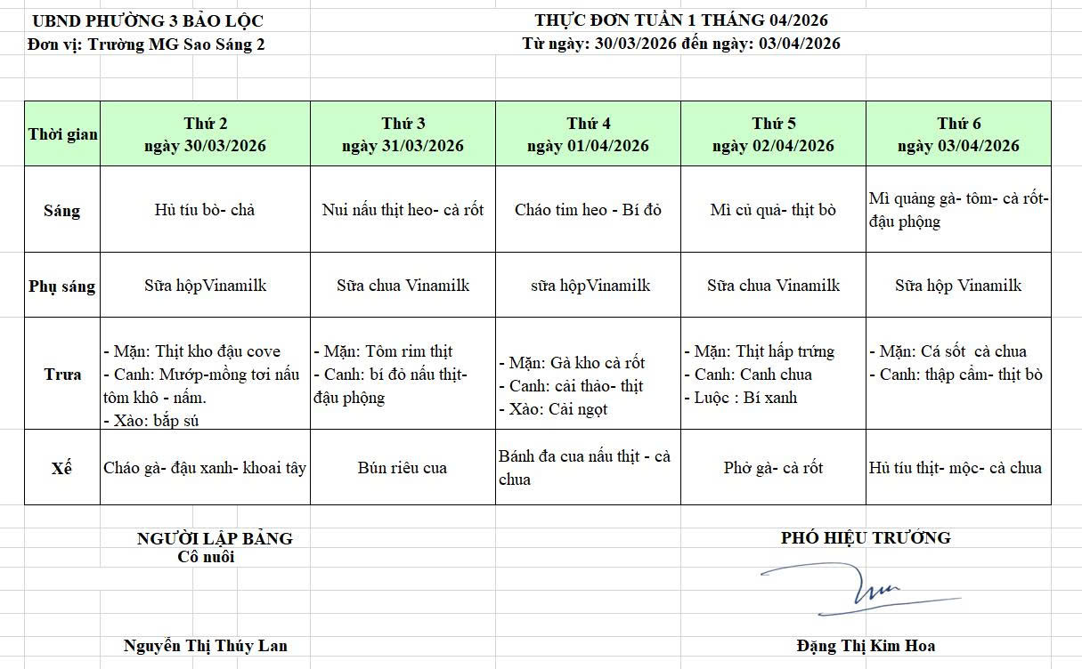 THỰC ĐƠN TUẦN 1 THÁNG 4/2026
