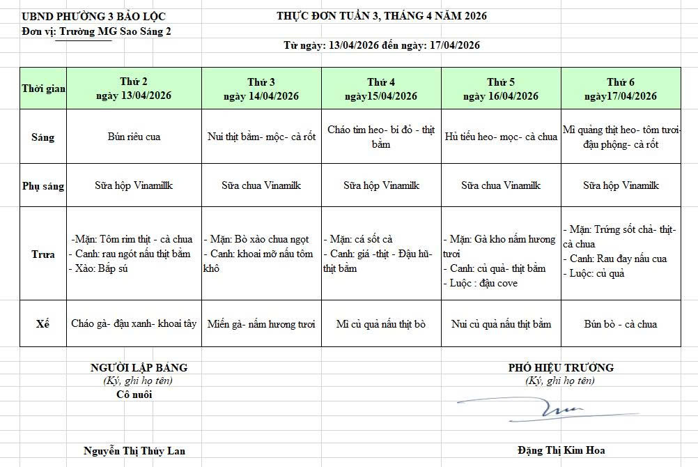 THỰC ĐƠN TUẦN 2 THÁNG 4/2026