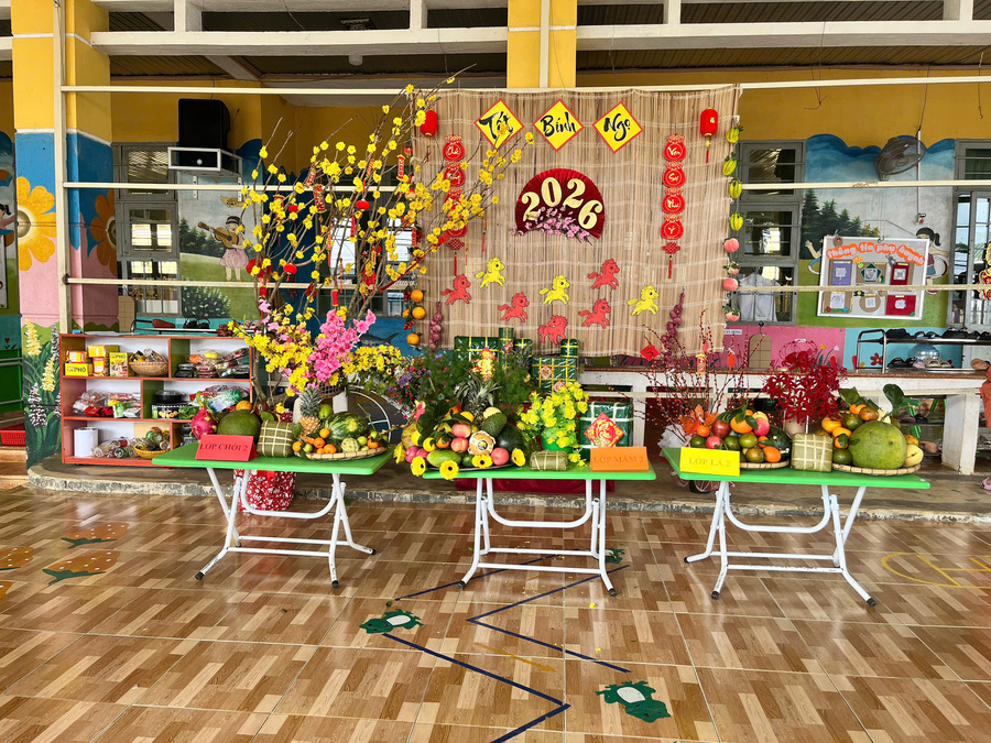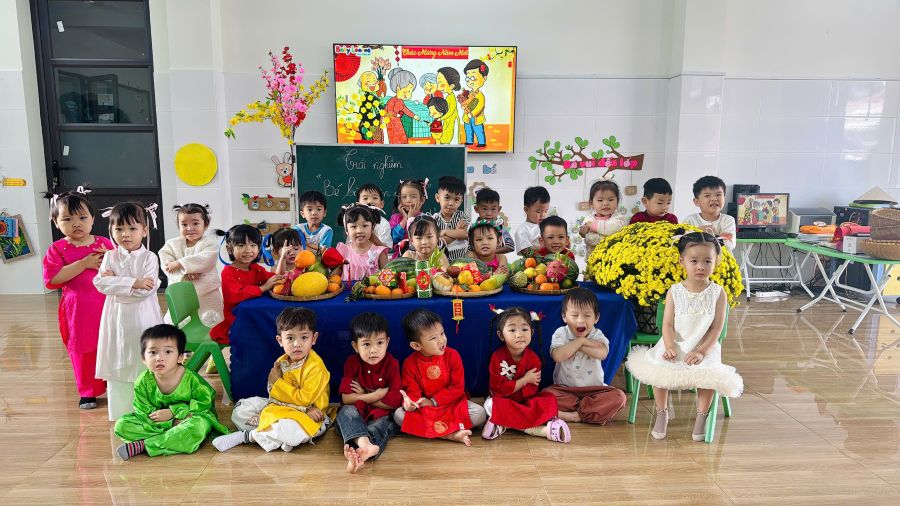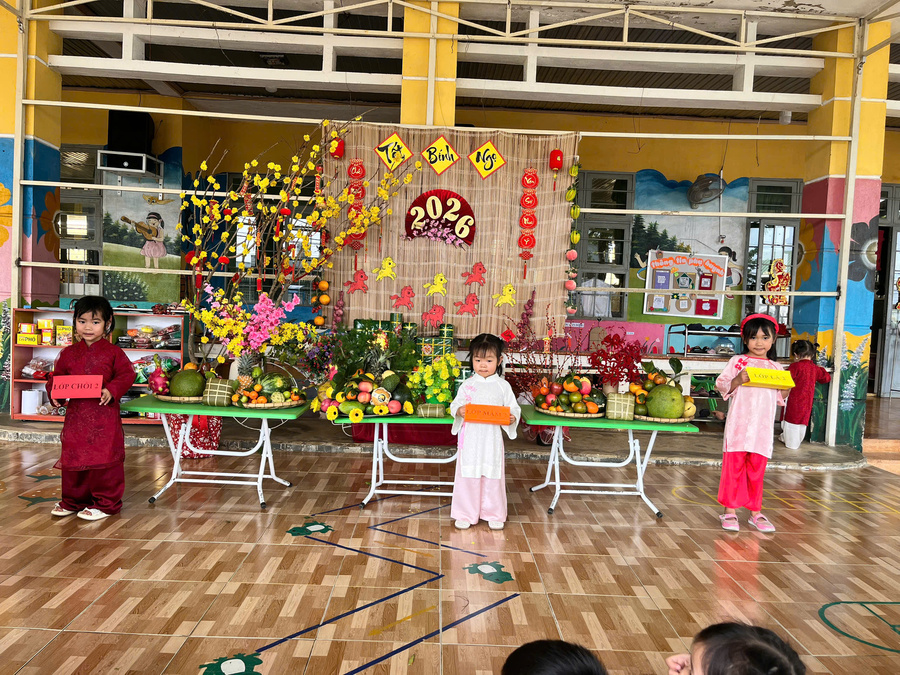 Các bé cũng được tham gia hoạt động trải nghiệm chưng mâm quả ngày Tết, giúp trẻ hiểu thêm được phong tục truyền thống vào dịp Tết cổ truyền của người Việt Nam.